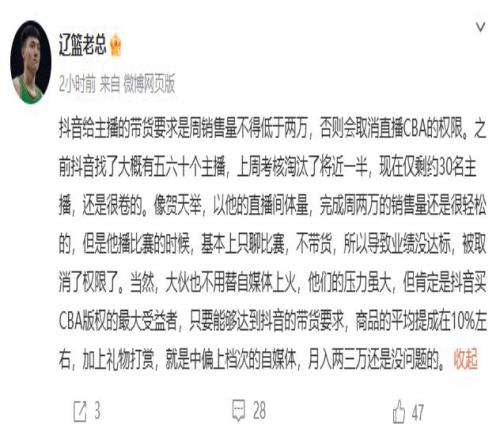 据博主“赵指导说辽篮”解释,某平台对CBA主播有考核标准:给主播的带货要求是周销售量不得低于两万,否则会取消直播CBA的权限。之前找了大概有五六十个主播,上周考核淘汰了将近一半,现在仅剩约30名主播,还是很卷的。像贺天举,以他的直播间体量,完成周两万的销售量还是很轻松的,但是他播比赛的时候,基本上只聊比赛,不带货,所以导致业绩没达标,被取消了权限了。